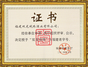 雙龍戲珠酒業(yè)作為福建省白酒研發(fā)中心,榮獲福建老字號(hào)產(chǎn)品、福建省農(nóng)業(yè)產(chǎn)業(yè)化龍頭企業(yè)、福建東南窖酒文化館、科技小巨人領(lǐng)軍企業(yè),國家守合同、重信用單位等榮譽(yù)。